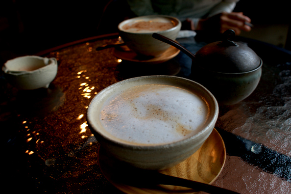 ドッグカフェqunqunのテラスでしとしとと降る雨を見ながらホットラテをいただく。店長さんとの会話も楽しい。
