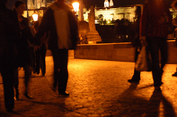 暗くなったカレル橋。オレンジ色の明かりがとても似合う。