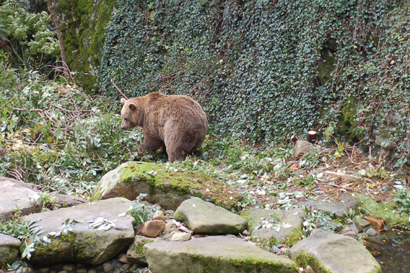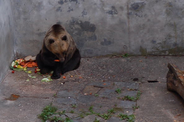 お城で16世紀から飼われている熊たち。食事が済んでお散歩中。残った野菜で小鳥たちも朝ご飯。