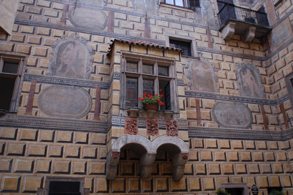 花が並んだ庭や壁画に見とれる。紋章もかっこいいのです。