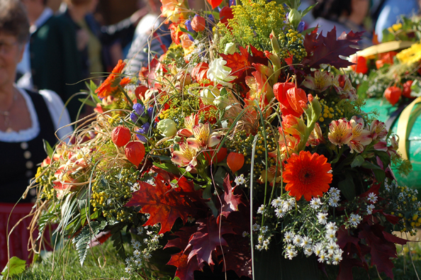 とっても鮮やかなフラワーアレンジメント。かわいいダンドゥールを纏ったおばさまたち。