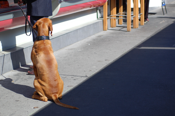向こうのワンコはほんとにいいこが多い。買い物中のご主人様を隣でお座りして待っている。