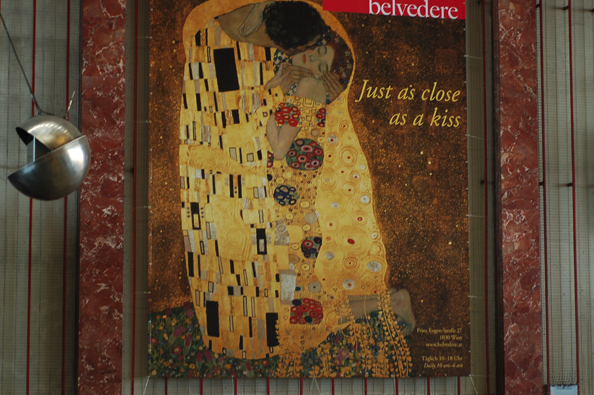 駅に大きく飾られたクリムトの絵。駅のオープンカフェでお茶をしながら出発時間を待つ。