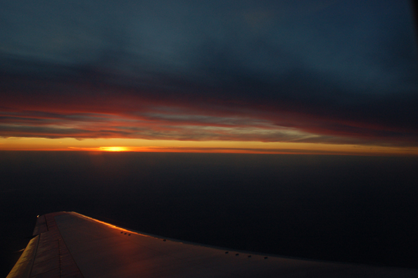 モスクワから発つときの素晴らしい夕陽。地平線ではなく雲の中に輝きながら消えていく。