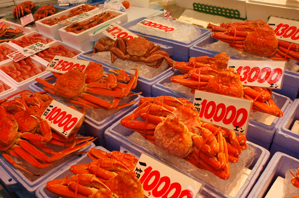 市場の名は「さかな街」。越前ガニがとれるためか、蟹だらけ。