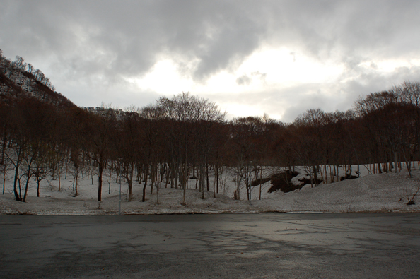 月山の山肌はまだ真っ白。道路の際にも排気ガスで薄汚れた雪が残る。