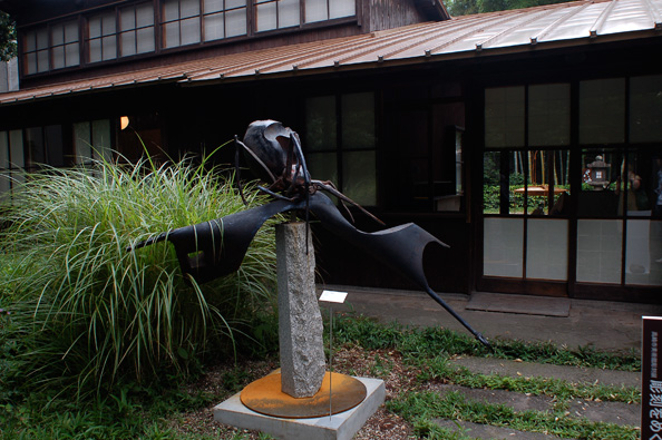 哲学堂の門をくぐると、正面玄関に1980年代制作の大型作品が展示。窓の奥に小さく見えるのが庭園です。