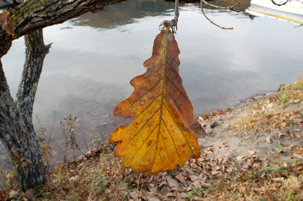赤と黄色に染まったもみじ。大きなかしわの葉。