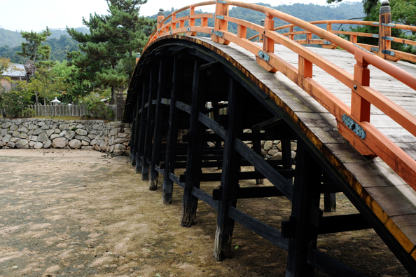 これも文化財の反橋。すごい湾曲のたいこ橋です。スニーカーですらズリ落ちそうなのに、お着物でどうやって歩いたんだか。
