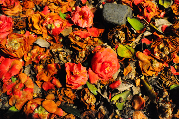 庭に落ちた、椿の花びら。