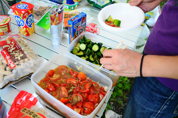 夏野菜を差し入れ。きゅうりのピリ辛漬け物とトマトのオリーブオイル和えも持ってったよ。