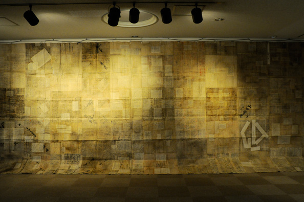 襖や帳簿に書かれていた生活に関する文字たちで織られた大きな作品をはじめ、地図を元にしたものなど、