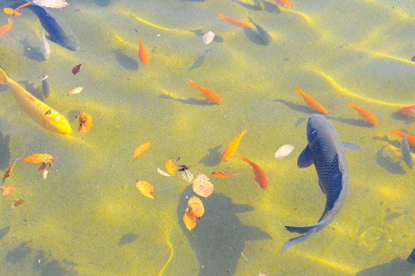 キラキラ光る水面の下には元気な鯉がたくさん。餌をあげたり、写真をとったり、平和な休日の光景。