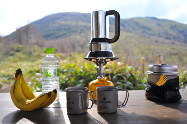 スノーピークのチタンマグをお供に。目の前に見えるのが湯の丸山。