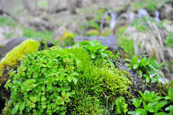 登山を終えたあと、立ち寄った沢がまたツボ。新芽と苔がいい感じ。