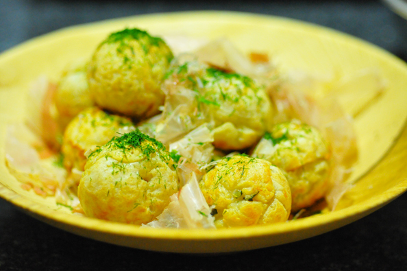 北海道か岡山の小麦粉をベースに、山芋たっぷり入れて、メインのタコのほかに浅葱と小エビと千切りしたガリをトッピング。